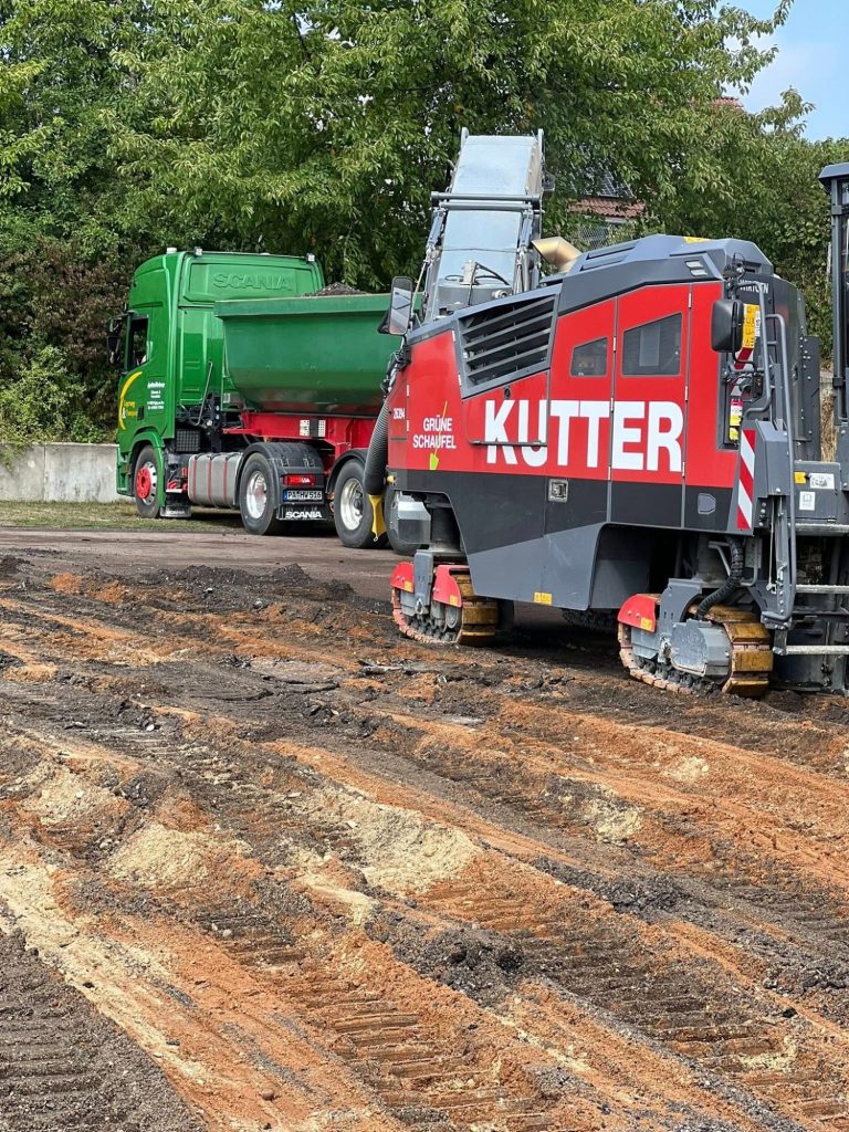 Am Hartplatz der Grundschule Großberg sind die Sanierungsarbeiten in vollem Gange.